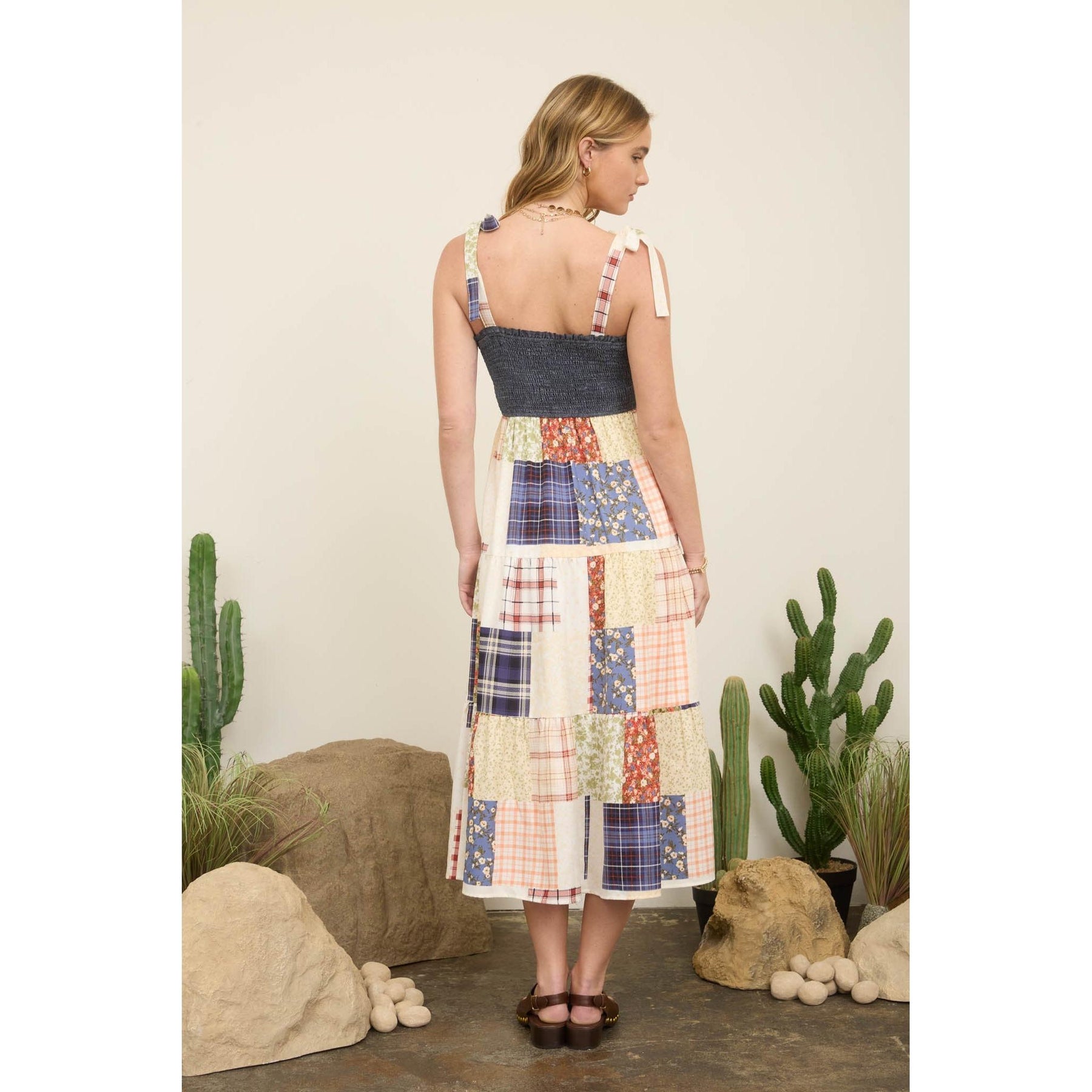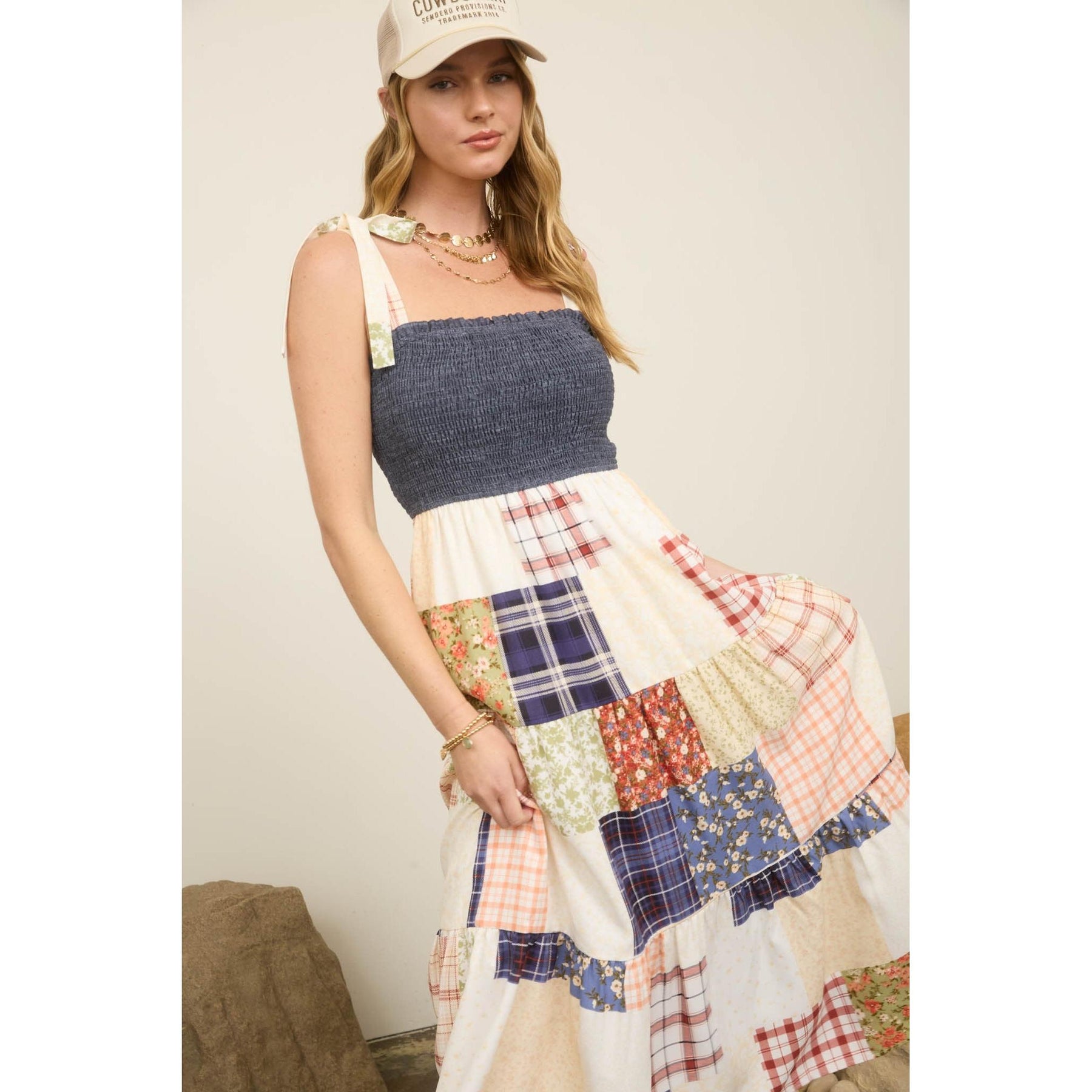 Smocked Denim Patchwork Maxi Dress || Denim Multi