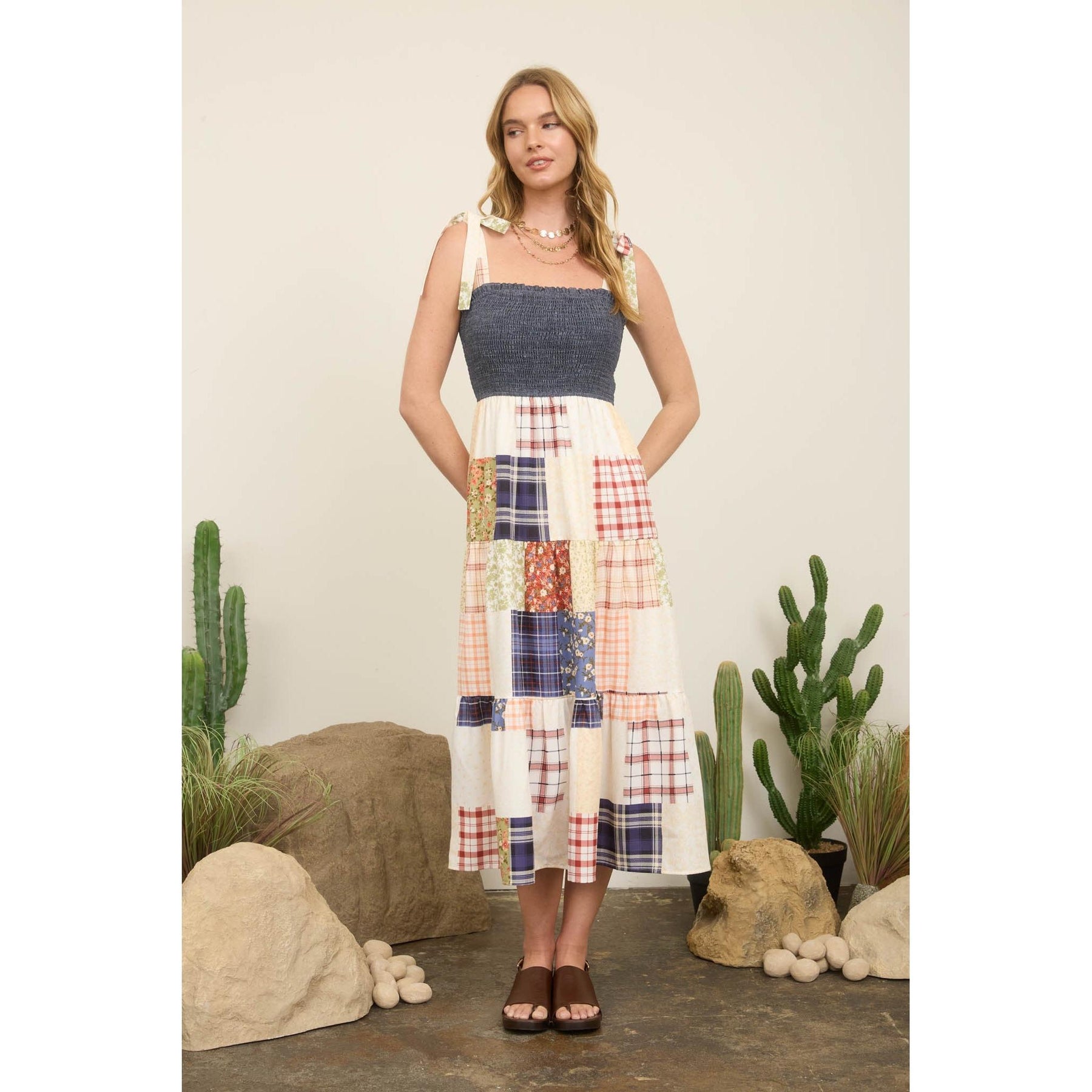 This tie-strap maxi dress combines vintage-inspired details with contemporary style. The smocked bodice creates a flattering silhouette while the elastic waist ensures comfortable all-day wear. Mock button-down front and patchwork with a top denim construction add visual interest, while delicate lace trim and a ruffled hem complete the look. Perfect for casual outings or dressed up for special occasions.