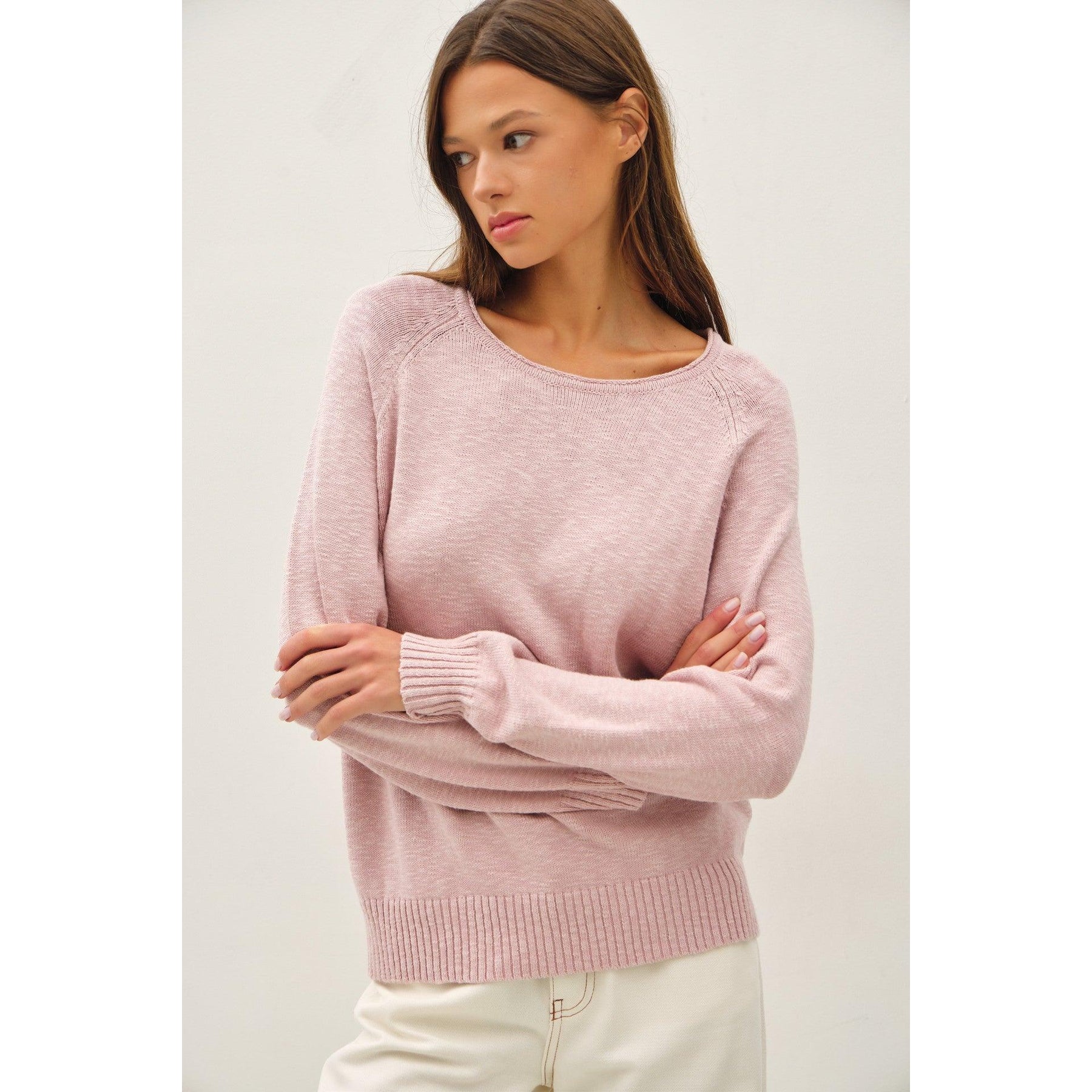 Crafted from lightweight slub fabric, this pullover sweater delivers effortless comfort without bulk. The relaxed fit and raglan sleeves provide unrestricted movement, while the rolled neckline and ribbed cuffs create a polished, intentional aesthetic. Perfect for layering or wearing solo, this versatile piece transitions seamlessly from casual to refined settings. Available in a sophisticated dusty pink that complements any wardrobe.