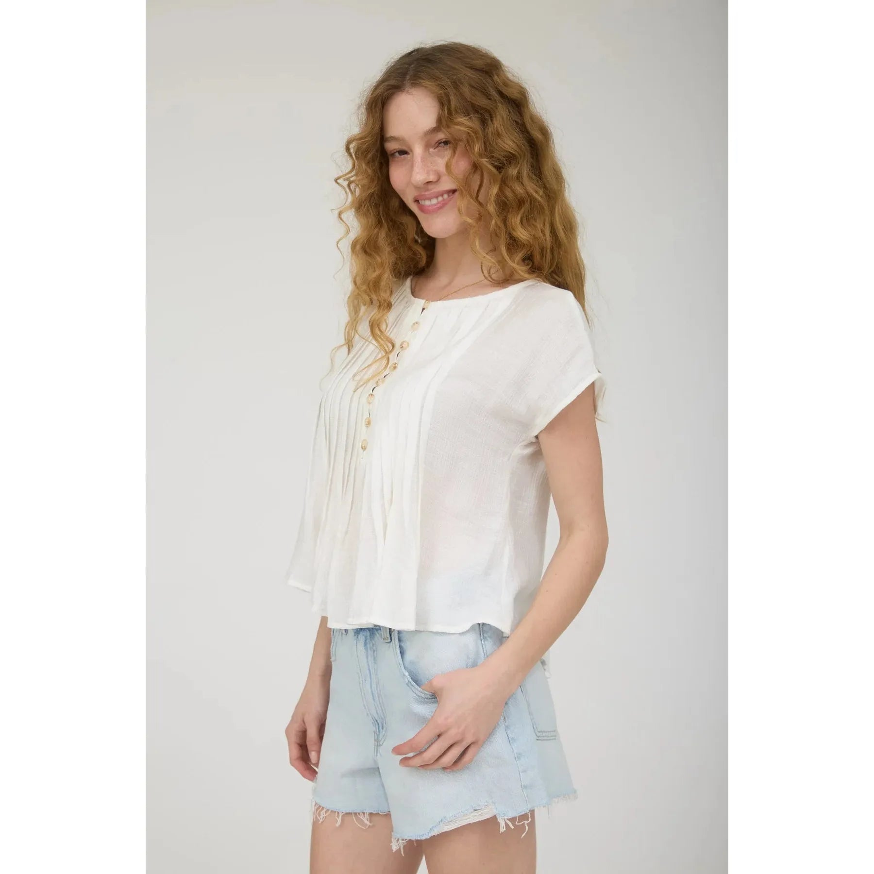 Effortless elegance meets fun with this charming button pintuck top. The drop shoulder silhouette creates a relaxed, modern vibe perfect for weekend adventures or casual office days. Delicate pintuck detailing adds texture and visual interest, while the half-button front gives you styling flexibility—wear it buttoned up for polished looks or leave it open for an easy, breezy feel. Crafted in crisp white, it's the versatile piece your wardrobe has been waiting for.