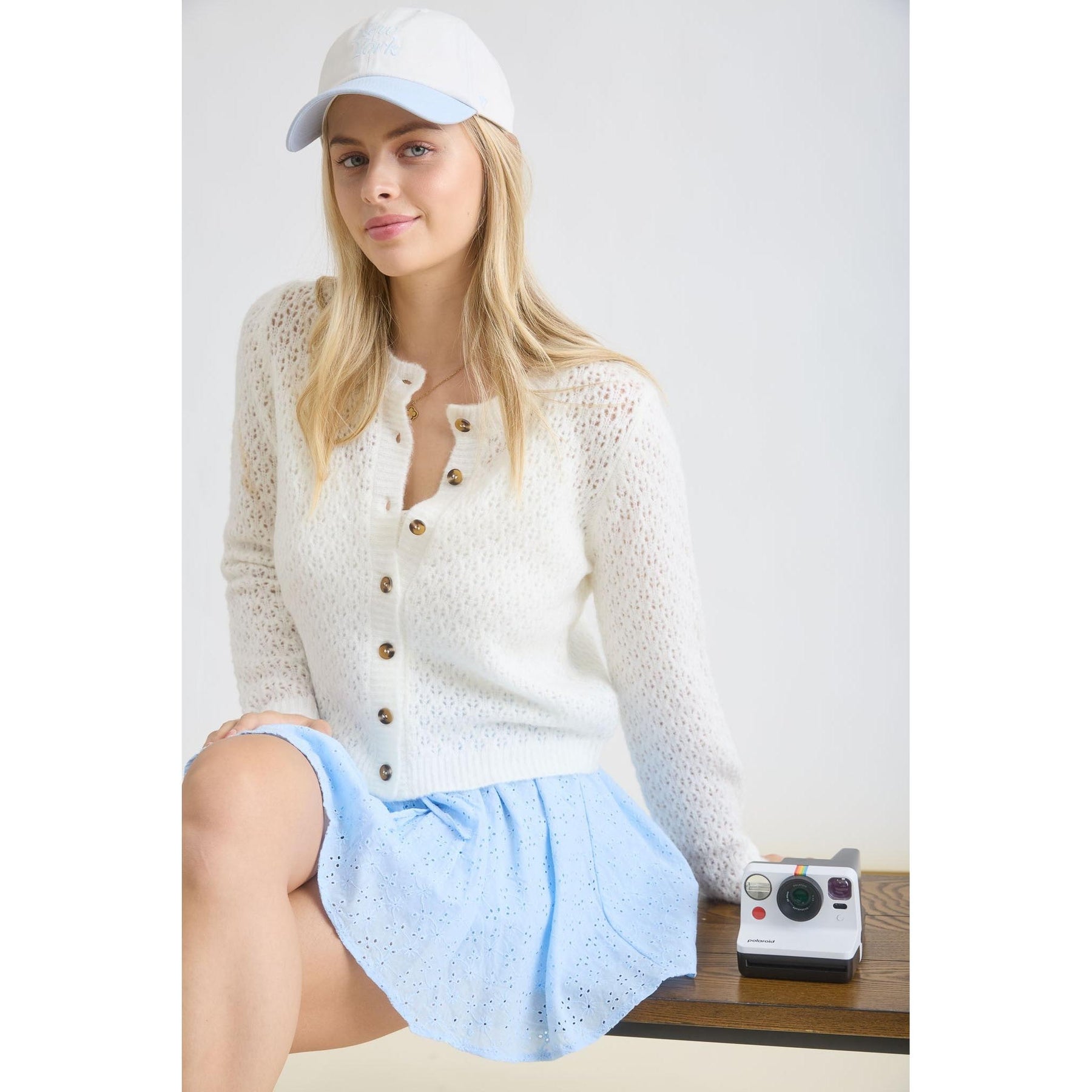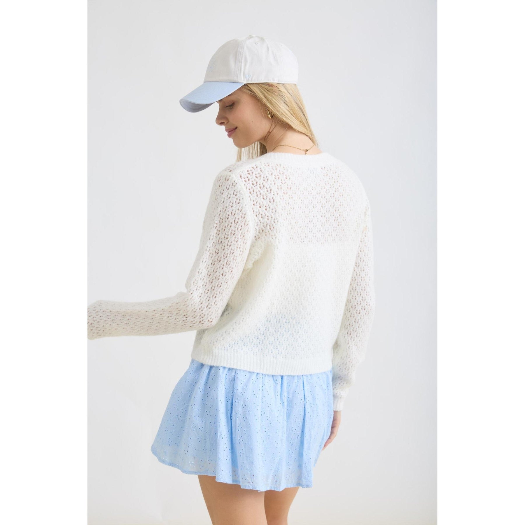 The delicate eyelet knit creates subtle visual interest, while the button-front closure allows for easy styling—wear it fully buttoned as a top or open over tanks and dresses. Finished with ribbed trim for a polished touch, this cardigan blends comfort with understated elegance.